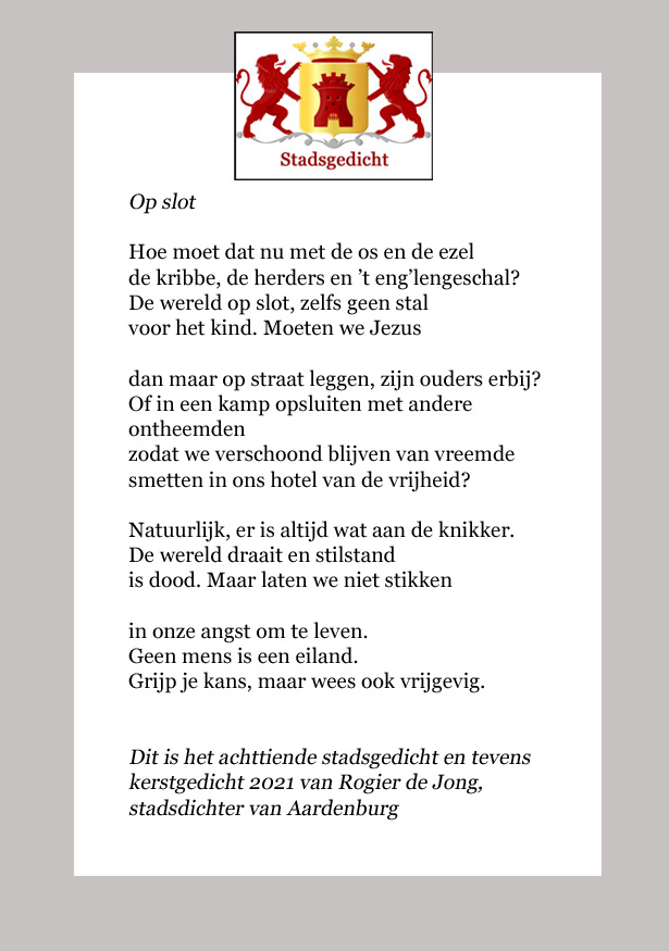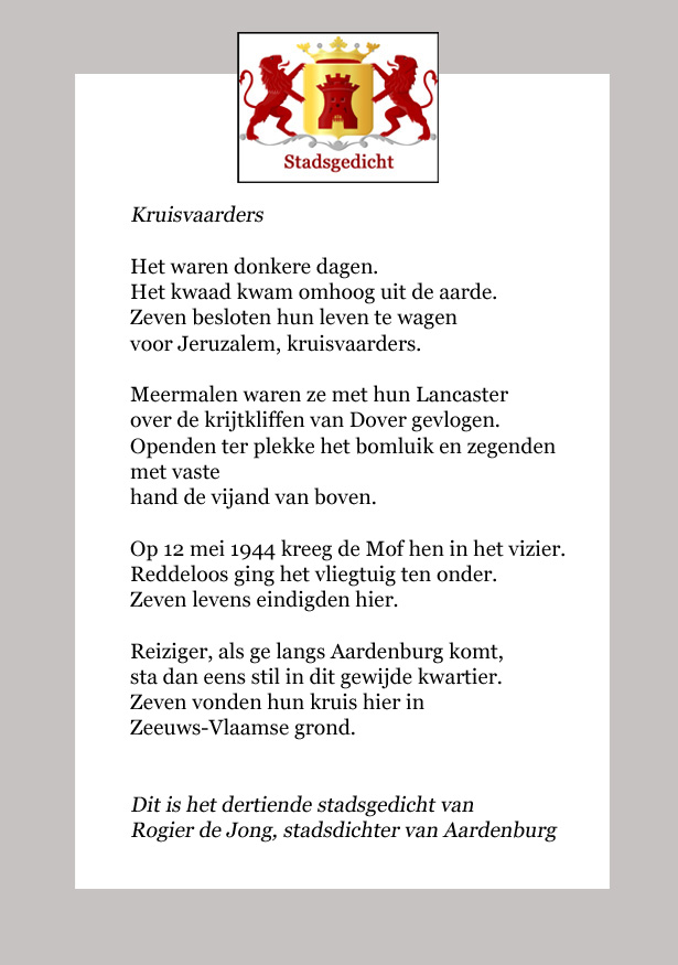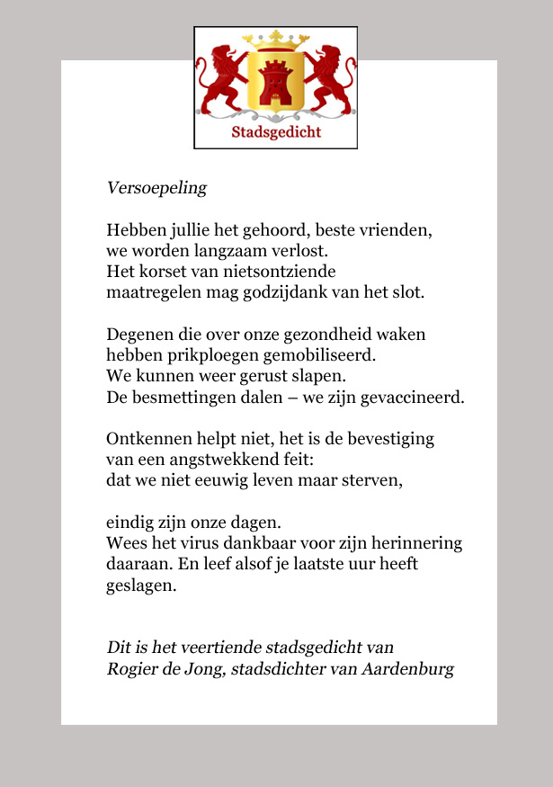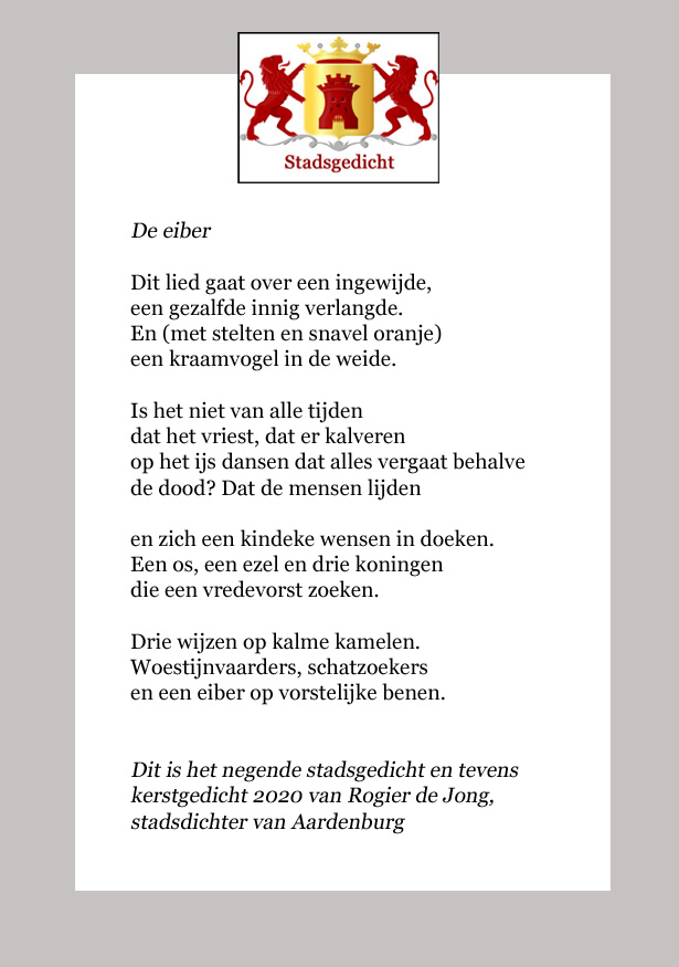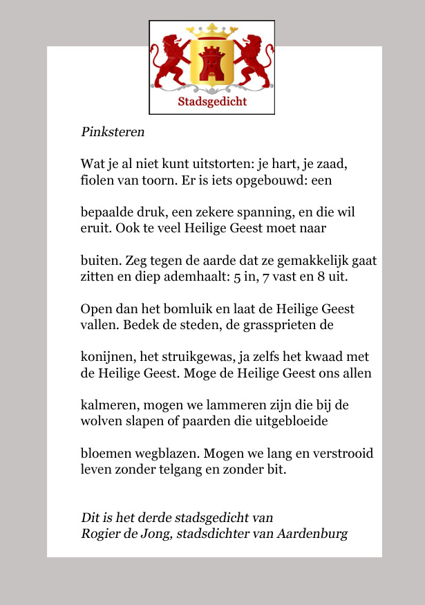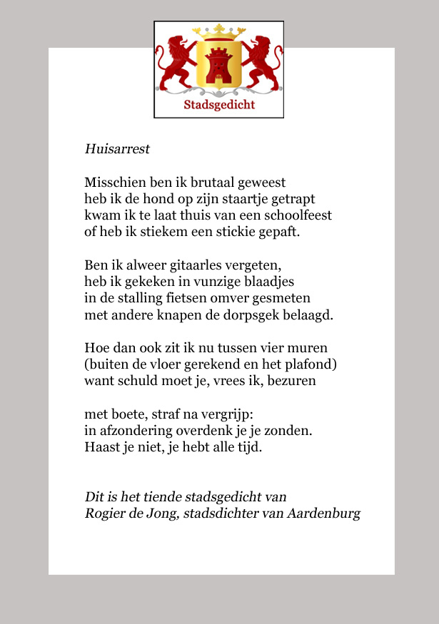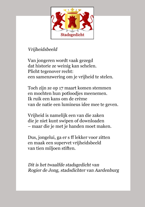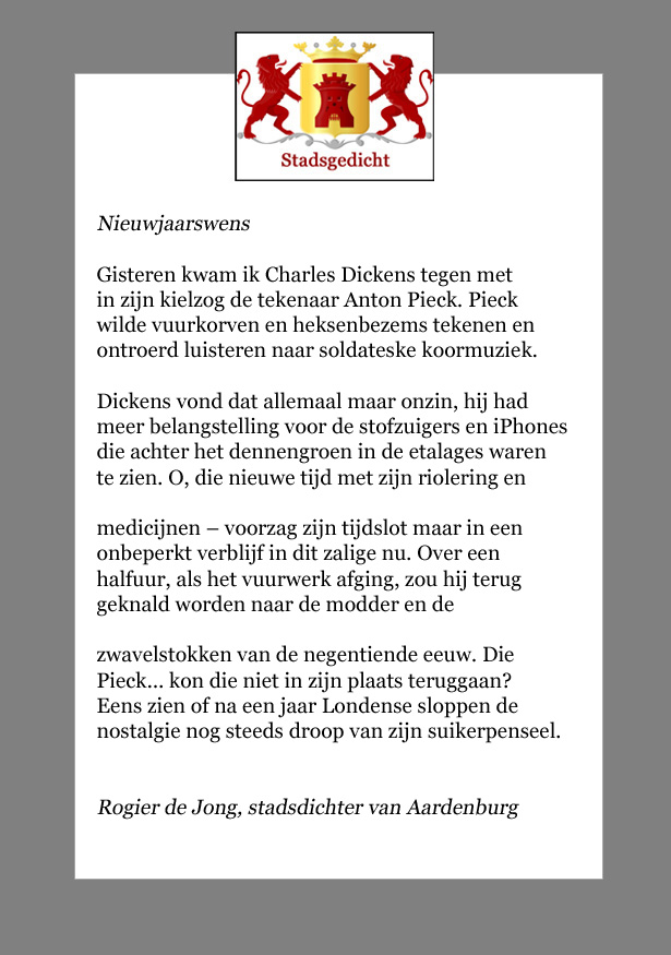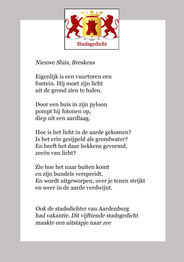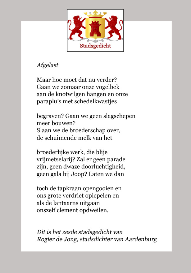 Helaas heeft de wedstrijd om een nieuwe stadsdichter voor Aardenburg te vinden geen resultaat opgeleverd. Er waren te weinig serieuze inzendingen om uit te kiezen. Helemaal zonder stadsdichter zitten we echter niet, want…